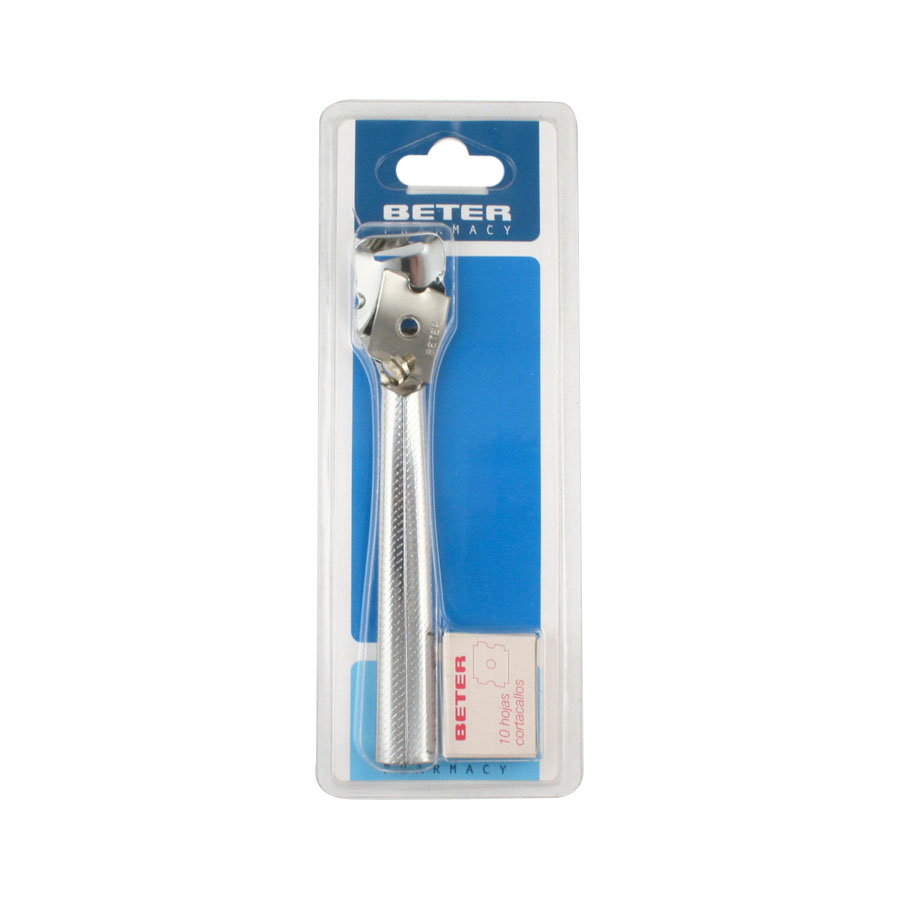 Cabezal metálico con curvatura especialmente estudiada para minimizar el peligro de corte. Elimina callos y durezas de forma eficaz.