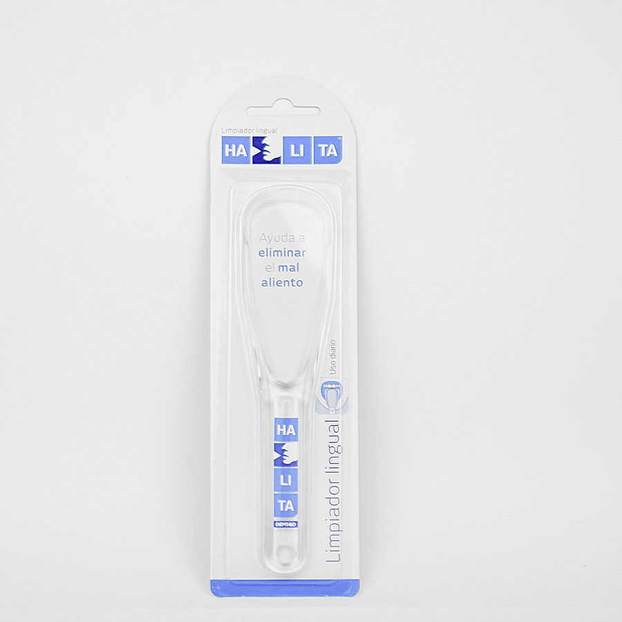 Limpiador lingual para eliminar por arrastre la placa bacteriana acumulada en esta parte de la cavidad bucal.