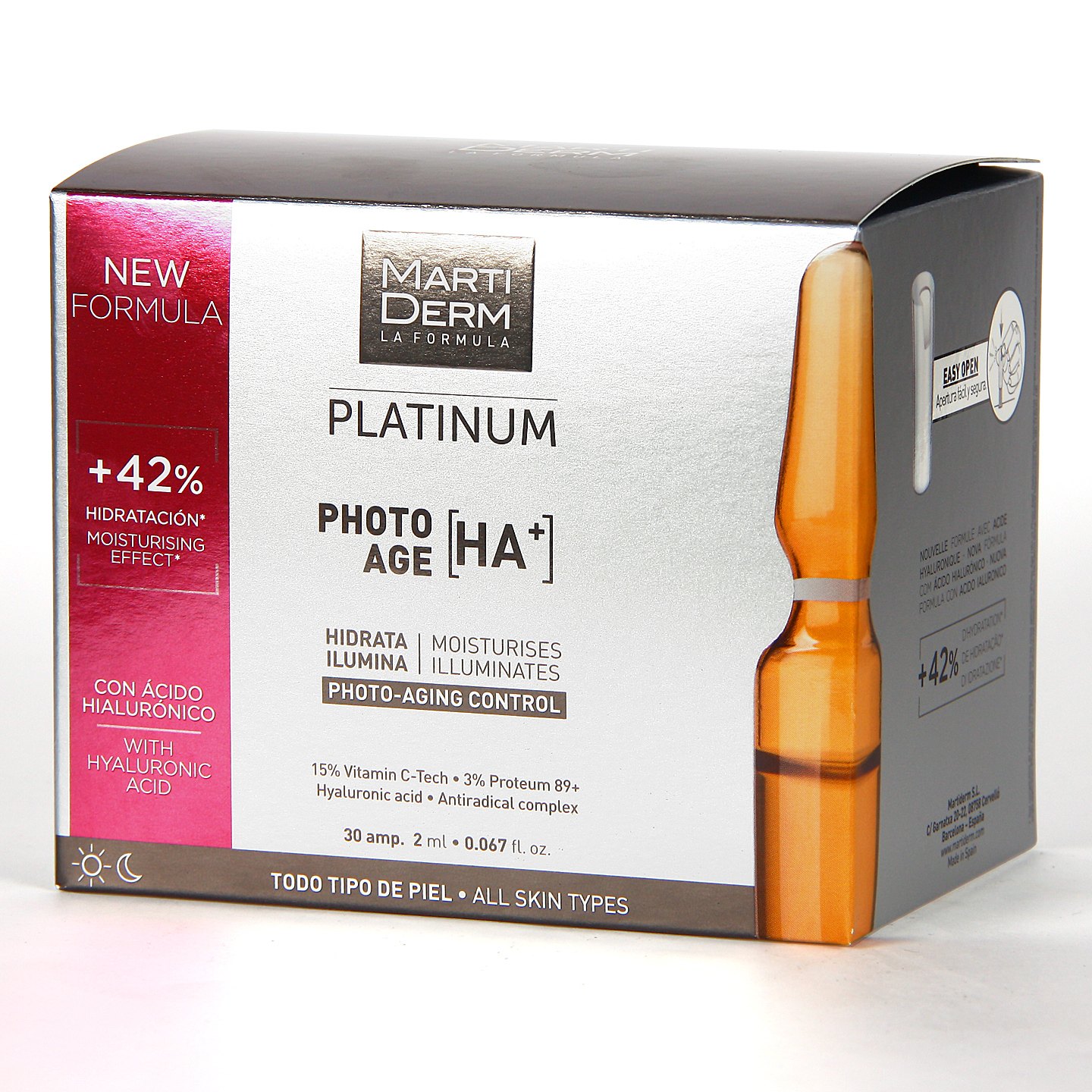 Tratamiento a base de ampollas antiedad que nos ofrece la marca Martiderm, ideal para todo tipo de pieles que busquen combatir los signos de desgaste en el rostro provocados por el impacto solar.